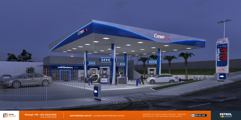Localizado em Porto Velho capital de Rondônia, a unidade da Rede Cernov precisava de um trabalho de identidade visual elaborado minuciosamente para se destacar na baixada da avenida. O desnível entre a pista de rolamento e o pátio de abastecimento também era um empecilho para se comunicar de forma correta com o cliente final. Para elaborar a imagem do posto de gasolina Cernov II foi escolhida então pelo proprietário as cores azul e prata para harmonizar com as cores braço e vermelho do logotipo existente. Escolhemos trabalhar uma iluminação indireta na testeira de forma crescente e direcionando o olhar para os logos nas laterais. Para o totem, detalhes curvos para compatibilizar com o design da cobertura e painéis de LED em vermelho para contrastar com os detalhes do logo e dos detalhes do posto. Veja o resultado no site da Petrol VISUAL.